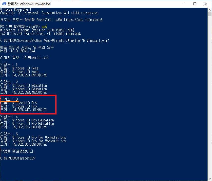 - 아래 명령어를 통해 wim 파일 내 필요한 에디션 번호 확인, 대소문자 구분 철저!